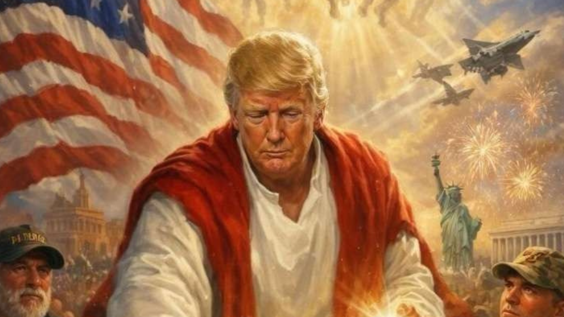 The AI-generated image is a clumsy mash-up of patriotic tropes — complete with flag, fireworks and (incongruously) the Statue of Liberty — and a reckless appropriation of Christian imagery for the purposes of political propaganda.